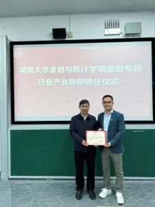 在交流后,湖南大学金融与统计学院院长为刘超峰颁发聘书,正式聘任其担任湖南大学金融与统计学院专业学位硕士研究生行业产业导师。这不仅是对其个人及Oceanpayment行业贡献的认可,更意味着理论与实践在校园中实现了“双向奔赴”。